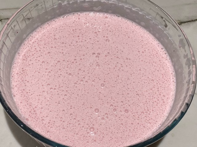 Take the fruit, and using a handheld mixer, blend it with a small tin of condensed milk (lait concentré 397g). Then add about 300ml of milk. The electric whisk will mix it well and add air.