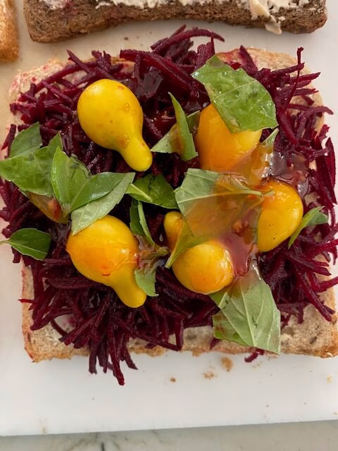 Take a generous amount of shredded beetroot (betterave), add tuna (thon) flakes, tomatoes (in the photo yellow pear variety). Add shredded basil (basilic).